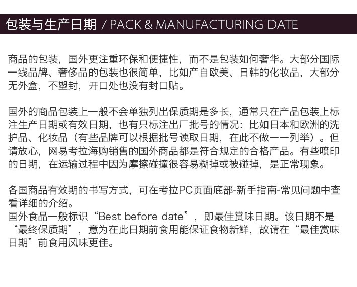 • 美妆商品保质期:美妆商品的生产日期/保质期标注可能和国内渠道购买的产品有所区别。